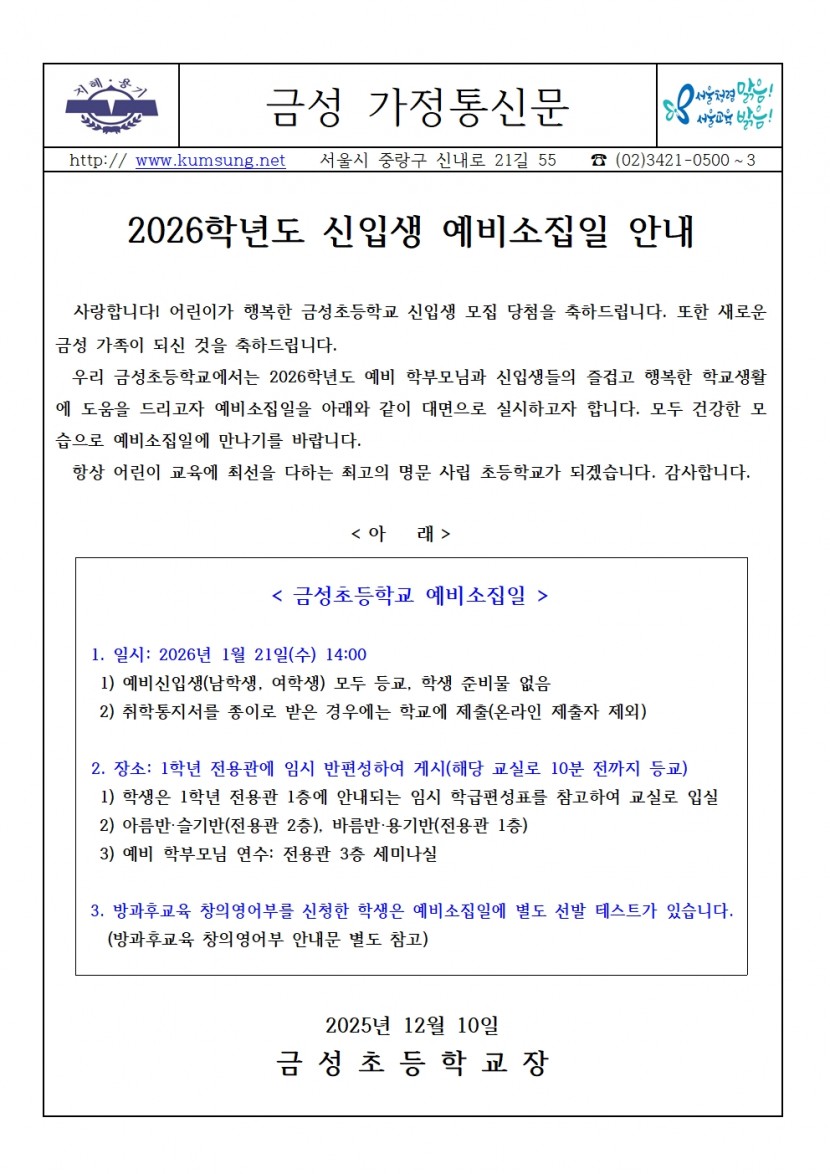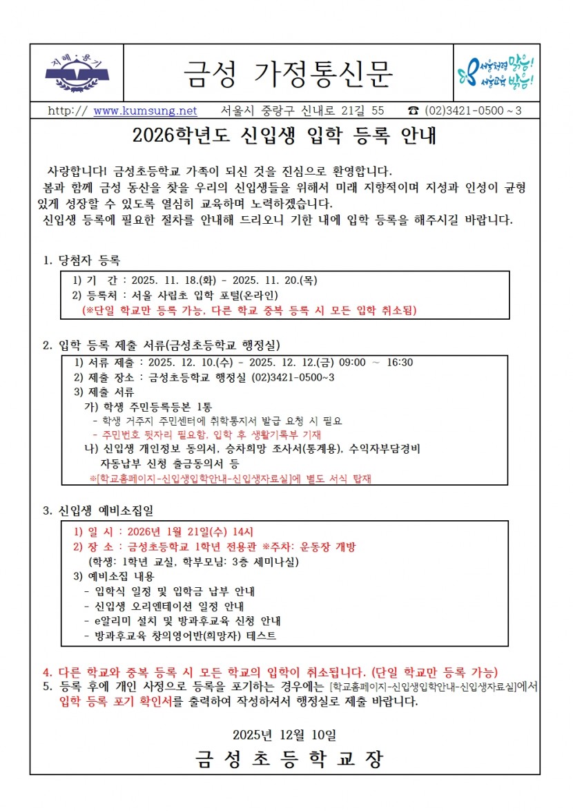 3) 금성초 홈페이지-[신입생 자료실]에 당첨자 및 대기자 명단 탑재 예정(추첨일 12시)