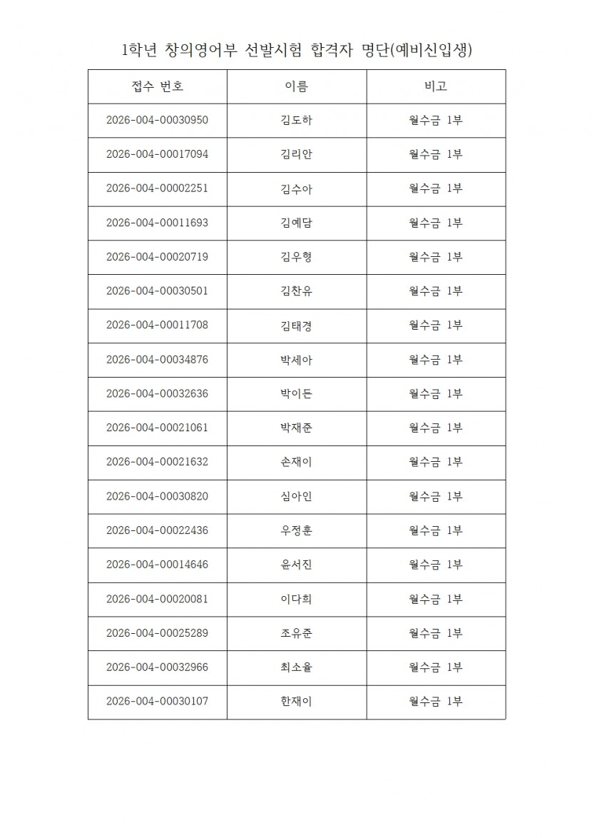 2026학년도 1학년 창의영어부 선발시험 합격자 명단