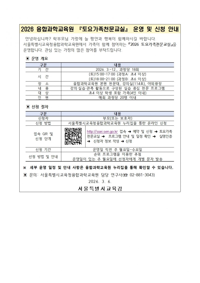 2026 융합과학교육원 <토요가족천문교실> 운영 및 신청 안내
