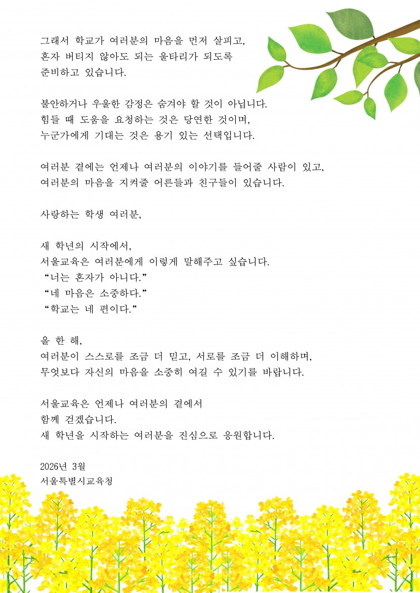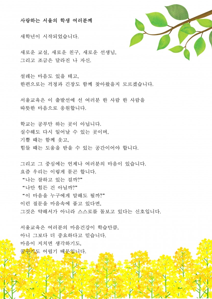 사랑하는 서울의 학생들을 응원하는 교육감의 편지