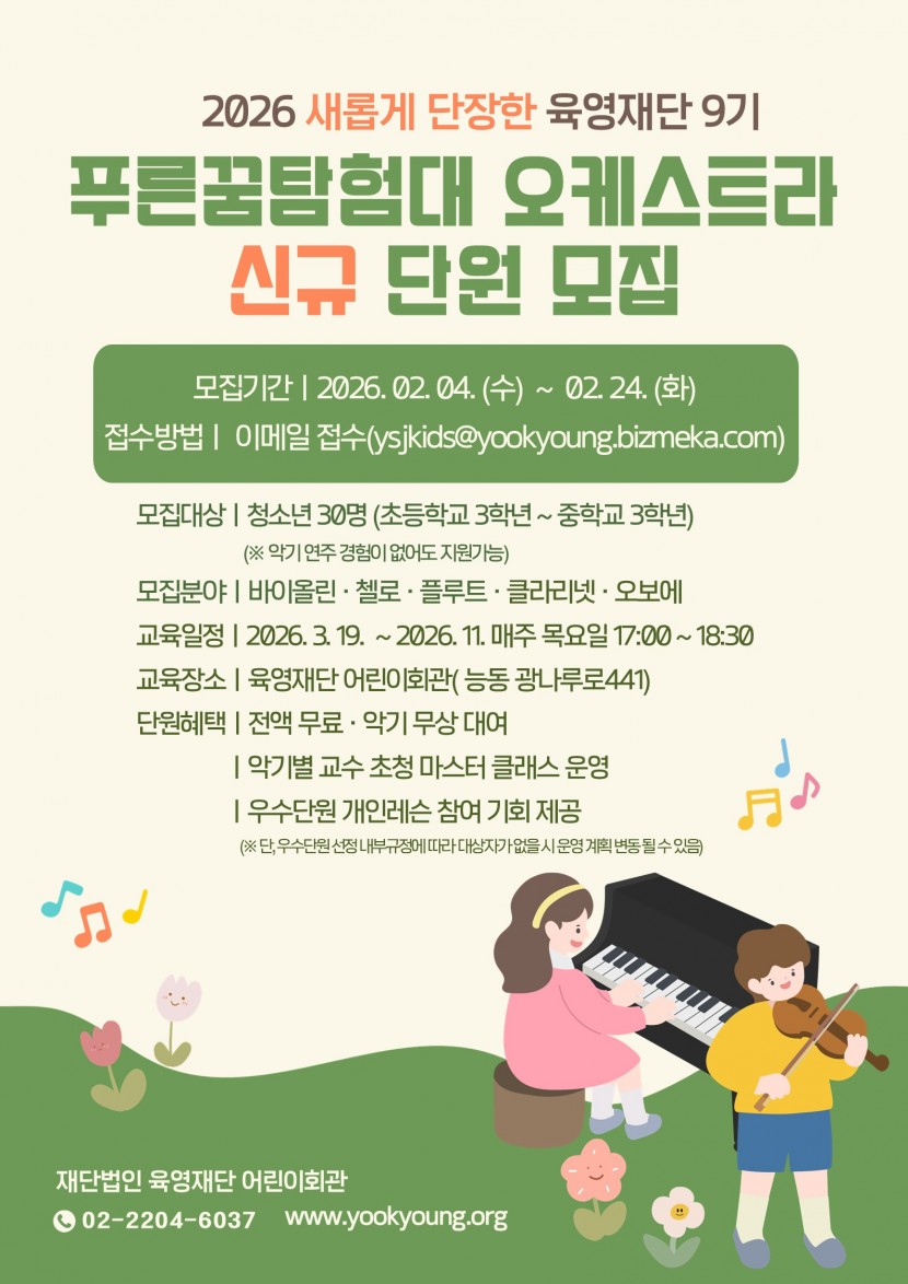 육영재단에서는 청소년의 인성 및 자신감 함양을 위해 <푸른꿈탐험대 오케스트라>를 운영하고 있으며, 2015년 1기를 시작으로 2026년 9기 단원을 다음과 같이 모집한다고 하오니 참고 바랍니다.