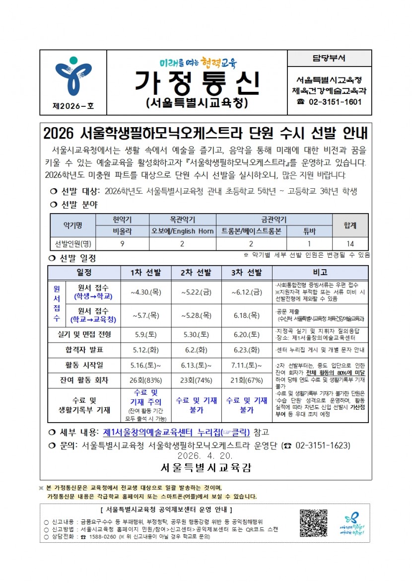 (서울시교육청 주관) 2026 서울학생필하모닉오케스트라 단원 수시 선발 안내 가정통신문