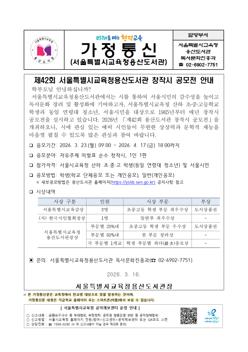 제42회 서울특별시교육청 용산도서관 창작시 공모전 안내
