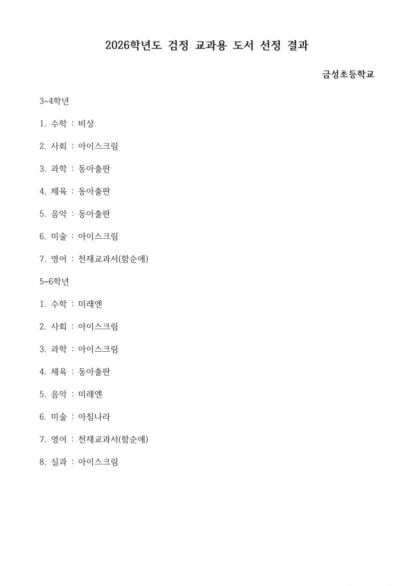 - 2026학년도 검정 교과용 도서 선정 결과금성초.pdf (83.0K) 29회 다운로드